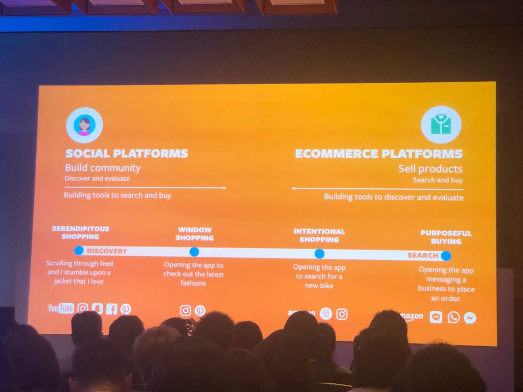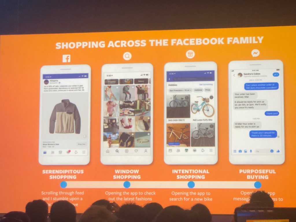 น่าสนใจมากที่ Facebook พูดถึงเรื่อง social commerce เยอะมากในงานนี้ ซึ่งไม่ใช่เรื่องใหม่สำหรับ SMEs และแม่ค้าออนไลน์ในเมืองไทย การใช้ social media อย่าง Facebook และ Instagram เป็นหน้าร้าน (หรือเรียกว่าเป็น catalogue) แล้วพูดคุยกันระหว่างผู้ซื้อผู้ขายผ่านทาง Chat ไม่ว่าจะเป็น messenger, IG direct, หรือ LINE ไปจนถึงการโอนเงินผ่าน mobile banking, e-banking วิธีการพูดคุยเพื่อขายของแบบนี้ Facebook เรียกว่า “Conversational Commerce”
